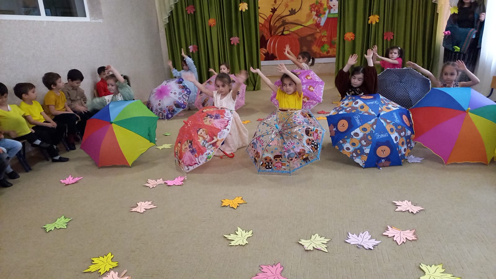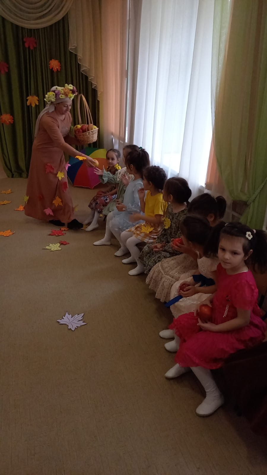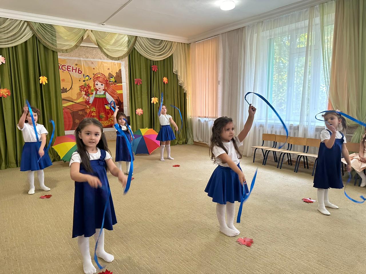 Дети под музыку входят в зал становятся на места и выполняют общий танец с листьями.
